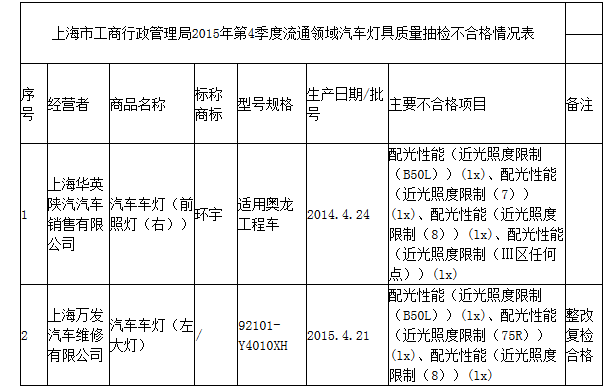 - 上海工商局发布汽车灯具质量抽检不合格名单 两企上榜